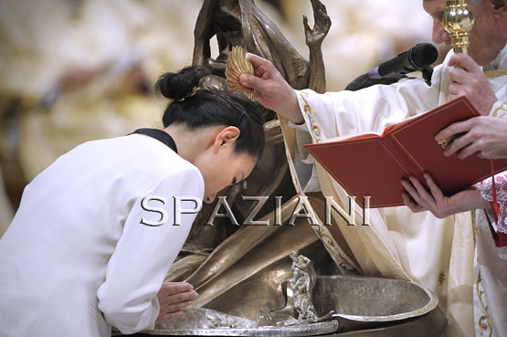 holds a candle during the Easter vigil mass in Saint Peter's